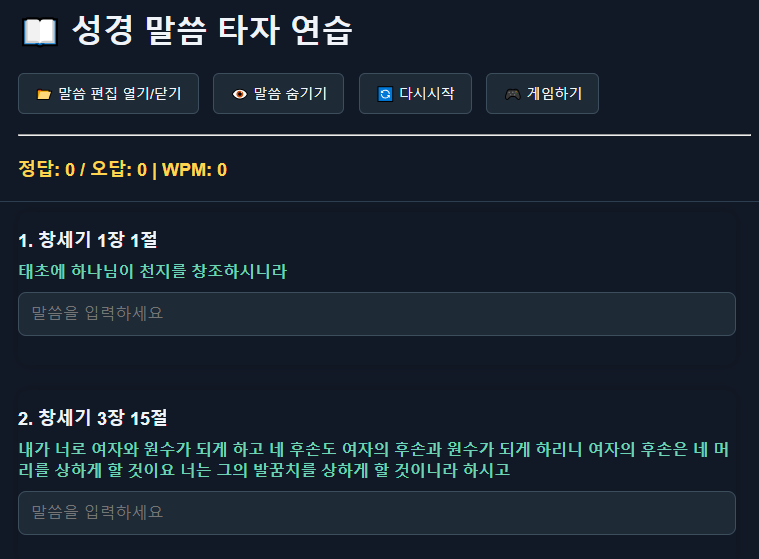 위 링크를 클릭하면 아래와 같이 나옵니다. 성경말씀을 인풋박스에 다 적고 엔터를 누르면 아래쪽에 위치한 인풋박스로 커서는 이동되며 정확하게 입력하셨다면 정답으로 카운트가 되며 철자가 틀렸다면 오답으로 카운트가 됩니다. 뛰어쓰기가 틀린경우는 오답처리가 되지 않도록 코딩을 했으니 뛰어쓰기는 신경쓰지 않으셔도 됩니다. 오직 철자가 틀렸는지 안틀렸는지만 주의 하시면 됩니다.