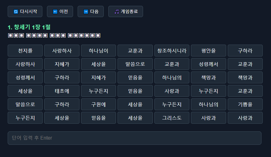 네모박스로 가려진 말씀이 드러나게 됩니다. 단어를 하나씩 하나씩 맞추는 게임이며 네모박스를 보면서 몇개의 단어인지 몇개의 철자로 구성되었는지 확인할수가 있어서 좀더 편리하게 문장을 완성할수가 있을겁니다. 모바일의 경우 손으로 글자박스를 터치하면 됩니다. 모바일도 타이핑해도 됩니다. 단지 조금 힘들지만 ... 순서대로 다 맞추면 다음 말씀으로 넘어가게 됩니다.