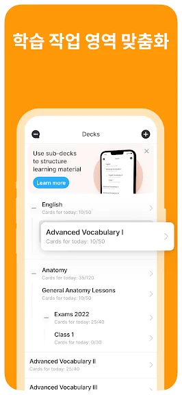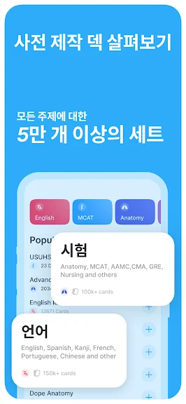 플래시 카드로 공부하세요: 나만의 플래시 카드 데크를 만들고, 사용자 정의하고, 공유하거나 언어 및 다양한 주제 학습을 위해 편집된 50,000개 이상의 데크를 다운로드하세요.