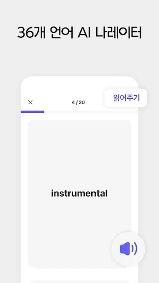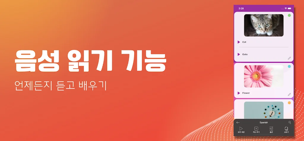 카드의 TTS(텍스트 음성 변환) 읽기가 지원됩니다. 카드는 영어뿐만 아니라 다른 여러 언어로도 소리내어 읽을 수 있어 듣기 이해에 이상적입니다. 카드를 반복해서 재생할 수도 있으므로 이동 중에 듣는 것과 같은 다양한 상황에서 유용합니다. 읽기 속도도 조절이 가능하므로 글을 이해하기 어려우시면 읽는 속도를 늦추셔도 됩니다.