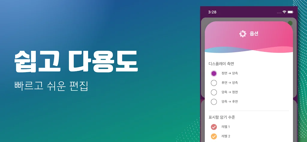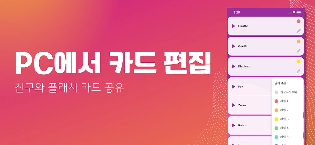 각 카드의 암기 레벨을 설정할 수 있습니다. 또한 자신이 어려운 카드만 표시하고 테스트할 수도 있습니다.