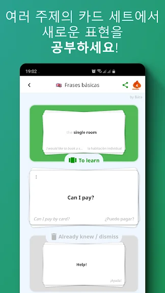 이 언어 학습 앱은 플래시 카드를 사용하여 학습자에게 외국어 또는 구문을 보여주고 학습자는 카드를 아는 여부에 따라 손으로 넘기고 풀게 됩니다. 단어를 제대로 암기하기 위해 단어를 반복합니다.
