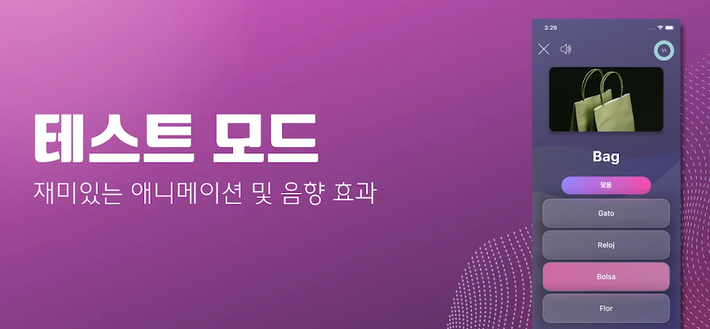 생성한 플래시 카드로 플레이할 수 있는 4가지 선택이 있는 테스트 모드가 제공됩니다. 테스트 모드는 오디오와 애니메이션을 통해 배우는 재미있는 방법입니다. 테스트 범위를 자유롭게 설정할 수 있습니다. 예를 들어 어려운 카드만 테스트하도록 설정할 수 있습니다.