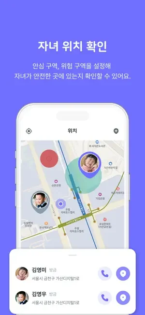 - 아이의 실시간 위치를 확인하고 안심 지역을 설정해 알림을 받을 수 있어요.
