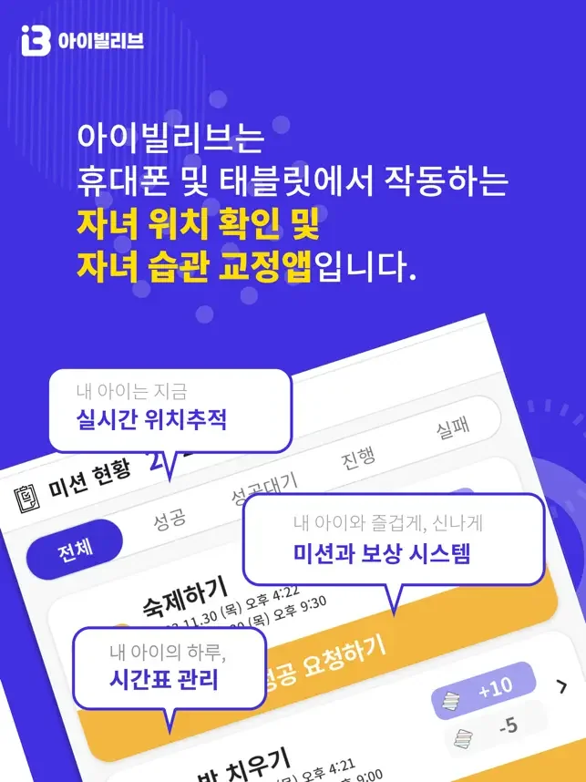 아이빌리브는 휴대폰 및 태블릿에서 작동하는 자녀 위치 확인 및 자녀 습관 교정 앱입니다.