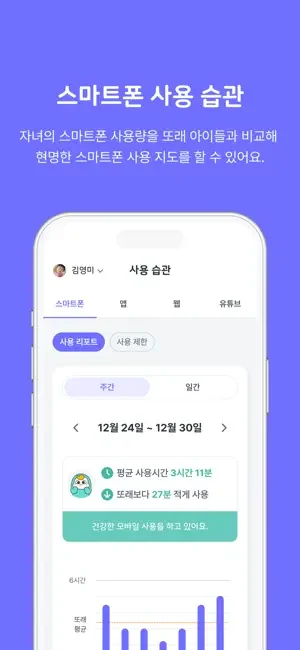 - AI 코치가 내 아이의 스마트폰 사용 습관을 분석하여 스마트폰 사용 시간, 앱 사용 시간과 같은 사용 환경을 맞춤형으로 설정해 줘요.