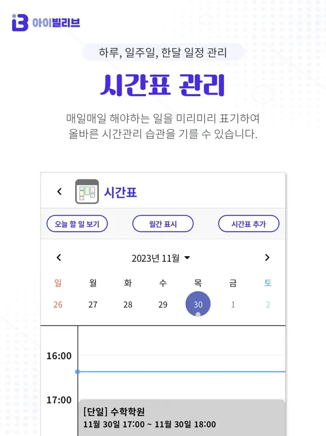 - 자녀의 시간표를 설정 해 올바른 습관을 기를 수 있습니다.
