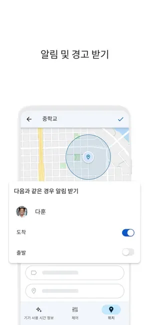 • 알림 받기: Family Link는 자녀가 특정 위치에 도착했을 때 또는 특정 위치에서 출발할 때 중요한 알림을 보내 줍니다. 또한 기기의 벨이 울리게 하거나 남은 배터리 수명을 확인할 수도 있습니다.