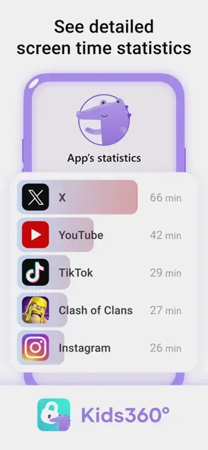 Kids360 앱은 자녀의 안전을 위해 설계되었습니다. 부모님들이 자신의 핸드폰에서 자녀의 스크린 타임을 모니터링할 수 있습니다. 당사에서 제작한 모바일 앱 트래커로 자녀가 핸드폰을 얼마나 사용하는지, 어떤 게임을 하는지, 어떤 앱을 자주 사용하는지 항상 알 수 있습니다.