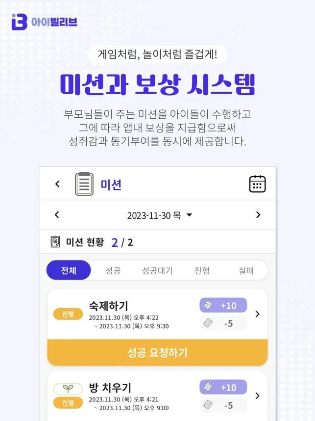 - 자녀에게 미션을 부여해 성취감을 줄 수 있습니다.