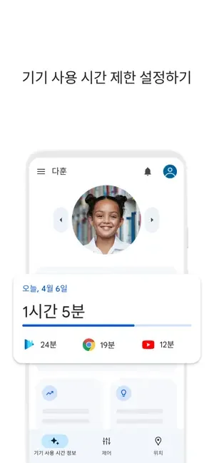 • 기기 사용 시간 제한 설정: Family Link를 사용하면 자녀 기기의 다운타임 및 앱 시간 제한을 설정하여 균형 잡힌 기기 사용 습관을 들이도록 도울 수 있습니다.