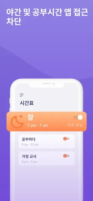 스케줄 사용 - 학교에서 보내는 시간이나 충분히 휴식을 취할 수 있는 수면 시간을 관리할 수 있도록 자녀의 스케줄을 선택하세요. 자녀가 게임, 소셜미디어 등 오락 앱에 사용하는 시간이나 핸드폰 사용을 제한할 수 있습니다