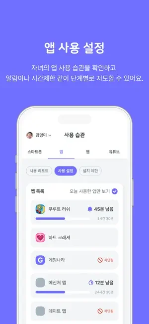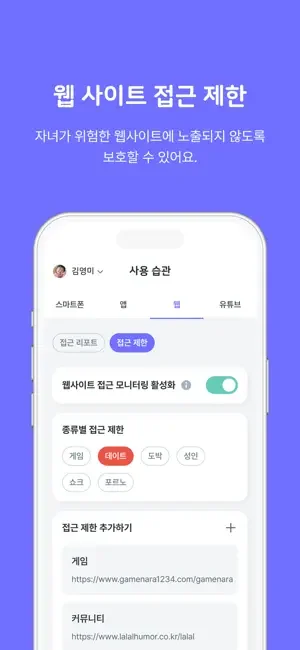 - 유해한 앱 사용이나 웹 사이트 접근 기록을 확인해 차단할 수 있어요.