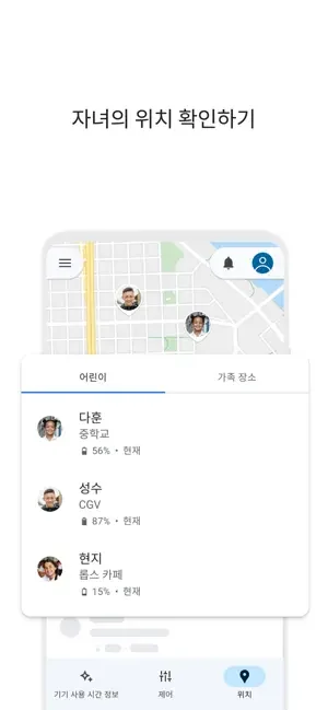 • 지도에서 자녀의 위치를 실시간으로 모니터링 (위치추적)