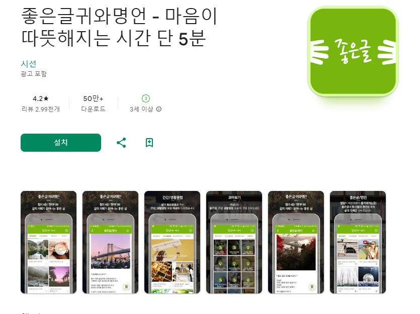 이 어플은 구글플레이스토어에서 "좋은글 명언 글귀"로 검색했을때 4번째로 나오는 어플입니다. 아래는 좋은글귀와명언 - 마음이 따뜻해지는 시간 단 5분 어플에 대한 자세한 설명이니 참고하세요.