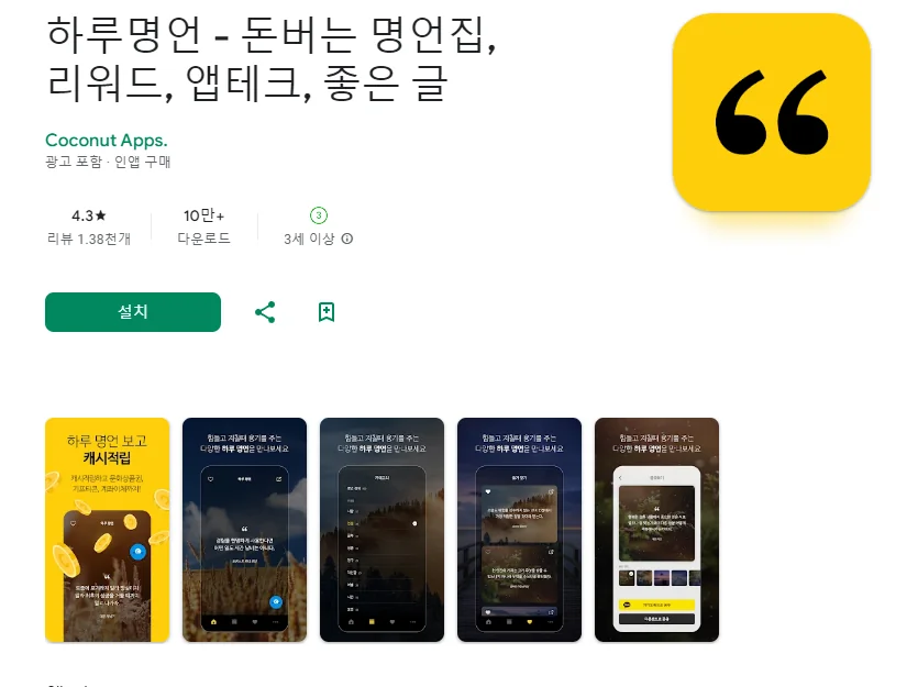 이 어플은 구글플레이스토어에서 "좋은글 명언 글귀"로 검색했을때 3번째로 나오는 어플입니다. 아래는 하루명언 - 돈버는 명언집, 리워드, 앱테크, 좋은 글 어플에 대한 자세한 설명이니 참고하세요.