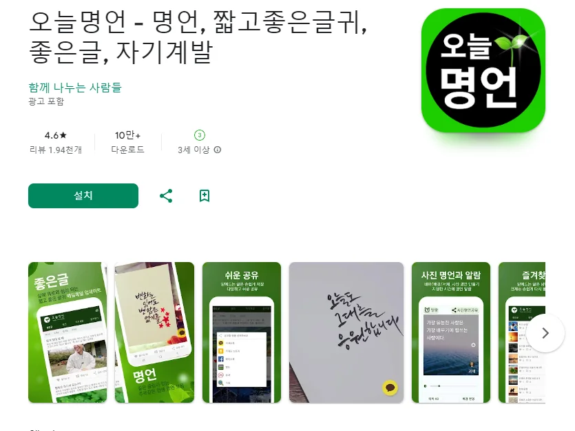이 어플은 구글플레이스토어에서 "좋은글 명언 글귀"로 검색했을때 1번째로 나오는 어플입니다. 아래는 오늘명언 - 명언, 짧고좋은글귀, 좋은글, 자기계발 어플에 대한 자세한 설명이니 참고하세요.