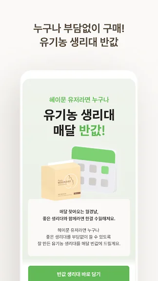 * 유기농 생리대 반값: 헤이문에서는 품질 좋은 유기농 생리대 중형 16개입 한 팩이 매달 반값이에요! 좋은 생리대를 부담없이 쓰는 것으로 월경 케어를 시작해봐요.