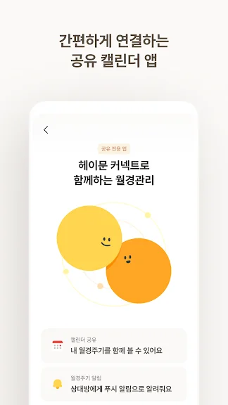 “오늘 월경 시작했어” “지금은 가임기야” 매번 전하기 힘들다고요? 월경 달력을 동기화 해 공유하세요. 상대방이 월경 달력 공유 앱 헤이문 커넥트를 설치하면 따로 말하지 않아도 월경 주기를 알려줄 수 있어요. 월경과 주기 관련 정보도 쉽고 친절하게 알려주죠.