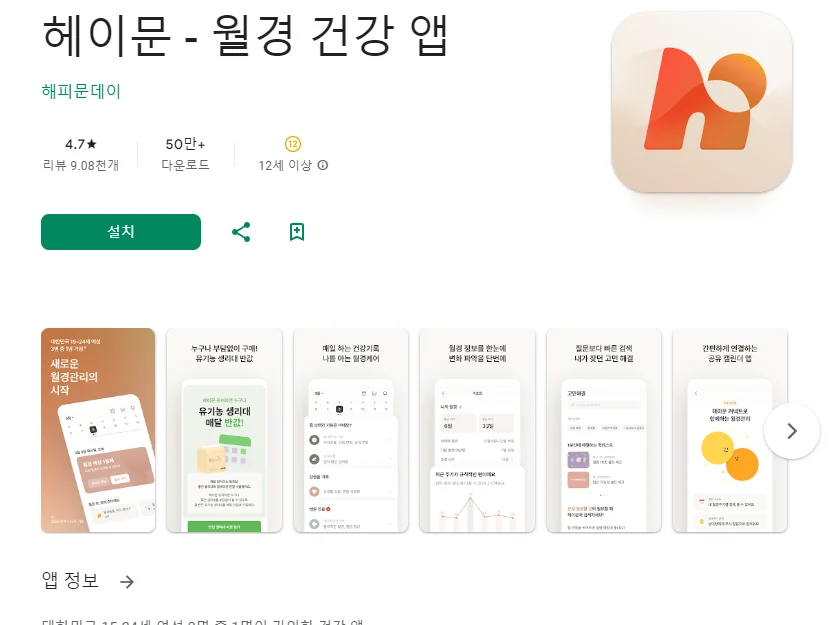 이 어플은 구글플레이스토어에서 "가임기 계산"로 검색했을때 5번째로 나오는 어플입니다. 아래는 헤이문 - 월경 건강 앱 어플에 대한 자세한 설명이니 참고하세요.