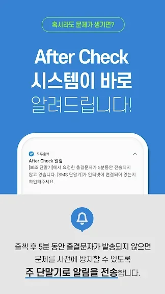 - 모두출첵은 출첵 후 5분동안 출결문자가 발송되지 않을 경우 바로 알려드리기 때문에 안심하고 사용하셔도 됩니다!