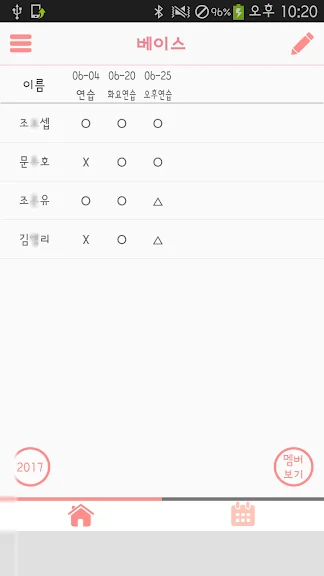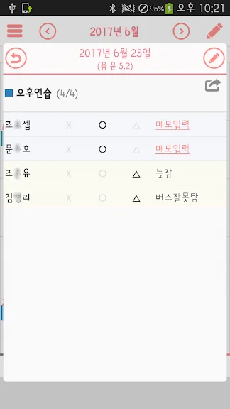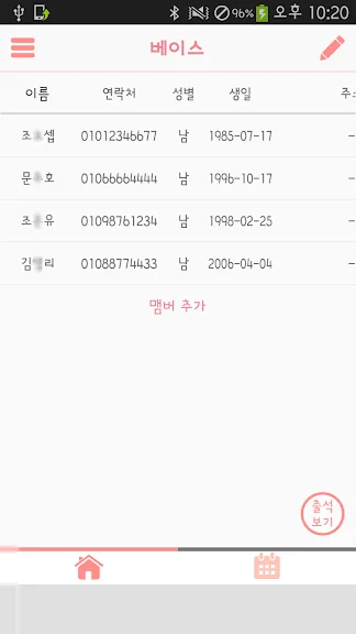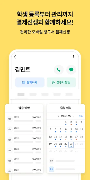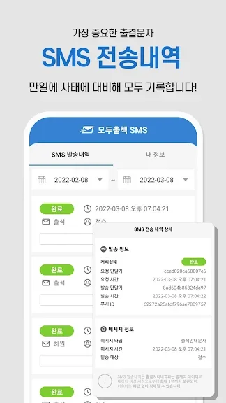 - 전화, 문자 메세지 전송, 메모 및 출석 시각 입력