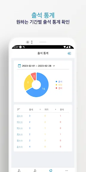 - 저장된 출석 데이터로 기간별, 개인별 통계 자료 보기