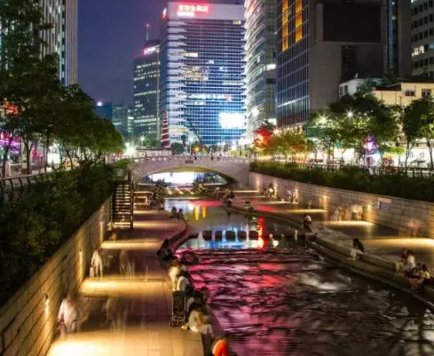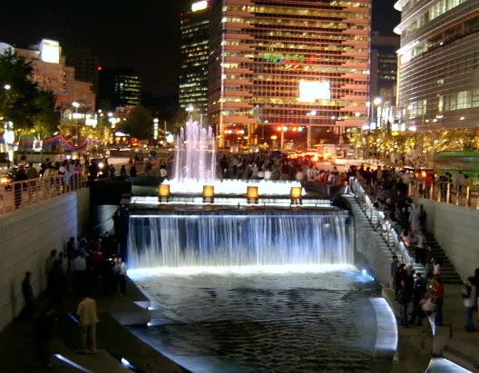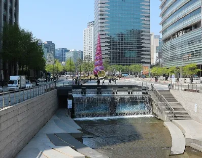 청계천은 광장과 함께 약 5.8km에 이르는 하천을 시민의 휴식처로 만든 명품 산책로입니다. 석양이 질 무렵, 반짝이는 하천 물결을 감상하며 연인이나 가족들과 함께 걷는 모습을 많이 볼 수 있어요. 광장에는 미니어처가 설치되어 이곳의 아름다운 모습을 한눈에 볼 수 있어요. 또한 소라 모양의 상징물과 함께 솟아오르는 캔들 분수와 시원하게 떨어지는 2단 폭포가 특별한 볼거리로 유명합니다.