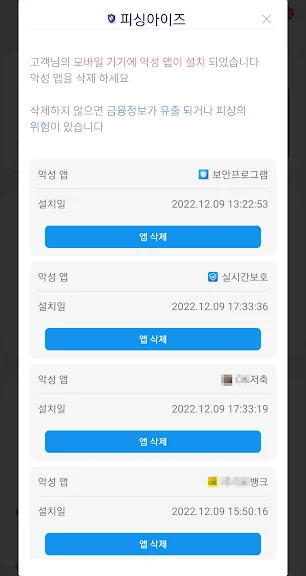 원격 조정 앱을 통한 자금 탈취, 전화 가로채기 앱을 통한 기관 사칭 전화 등 금융 사기에 악용되는 악성앱을 탐지하여 보이스피싱에 악용되는 것을 예방할 수 있도록 합니다.