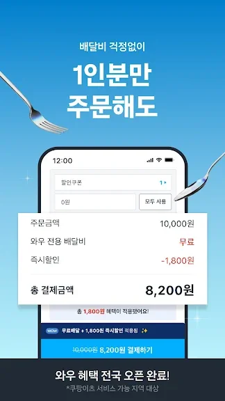 쿠팡이츠는 최소 주문 금액, 배달비, 할인 조건을 쉽게 필터링할 수 있어 혼자서도 부담 없이 음식을 주문할 수 있습니다. 원터치 결제 시스템을 통해 복잡한 절차 없이 안전하게 결제할 수 있어, 빠르고 간편한 배달 경험을 제공합니다.